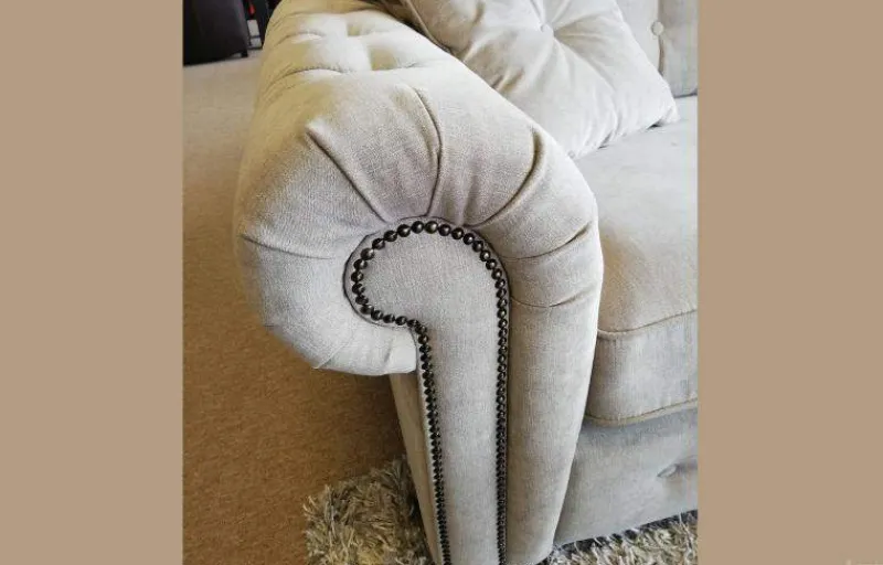 LET OP: Deze bank wordt standaard uitgevoerd met knopen inclusief nagels in de armleuning en met blokpootjes in de kleur beuken donkerbruin.