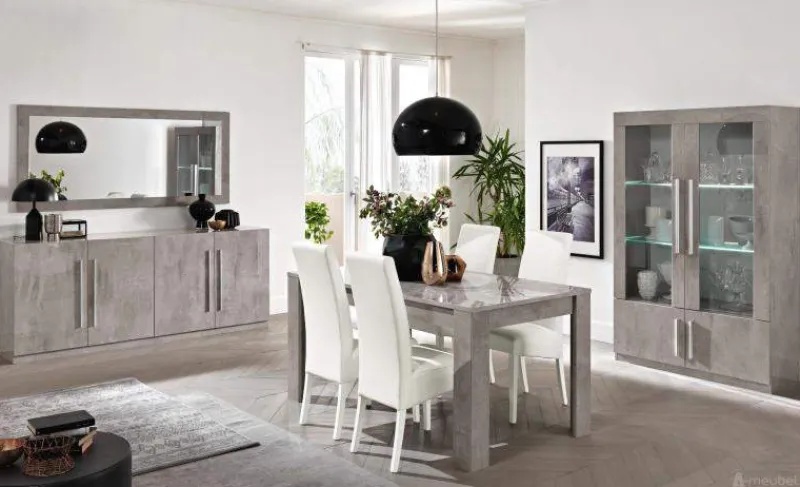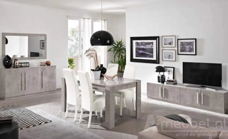 De woonkamerset Giethoorn Marmer is zoals de naam al aangeeft uitgevoerd in hoogglans marmer. De set bestaat uit een eettafel, geschikt voor vier personen, een salontafel, een tv meubel en een dressoir. U kunt ook kiezen voor een grotere eettafel of een groter dressoir. De set kan verder compleet gemaakt worden met een ruime kolommeubel en een bijpassende woonkamer spiegel. U kunt de kolommeubelen onder meer combineren met de tv meubel om er zo een mooi geheel van te maken.