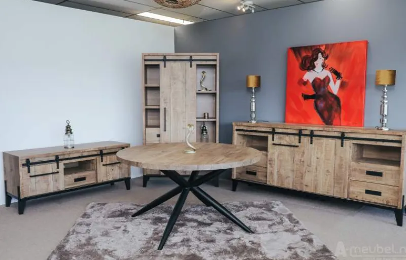 De Woonkamerset Vinkeveen is een mooie meubelset uitgevoerd in een prachtige houtlook. Deze woonkamerset is best omschreven als een warme sfeervolle set met een industrieel onderstel. Het industriele ophangsysteem van de deurtjes maken deze set echt tot een bijzonder design. De woonkamerset bestaat uit een dressoir, eettafel, salontafel en Tv-Meubel. U kunt deze set naar eigen wens uitbreiden met meerdere meubels van deze Vinkeveen lijn.