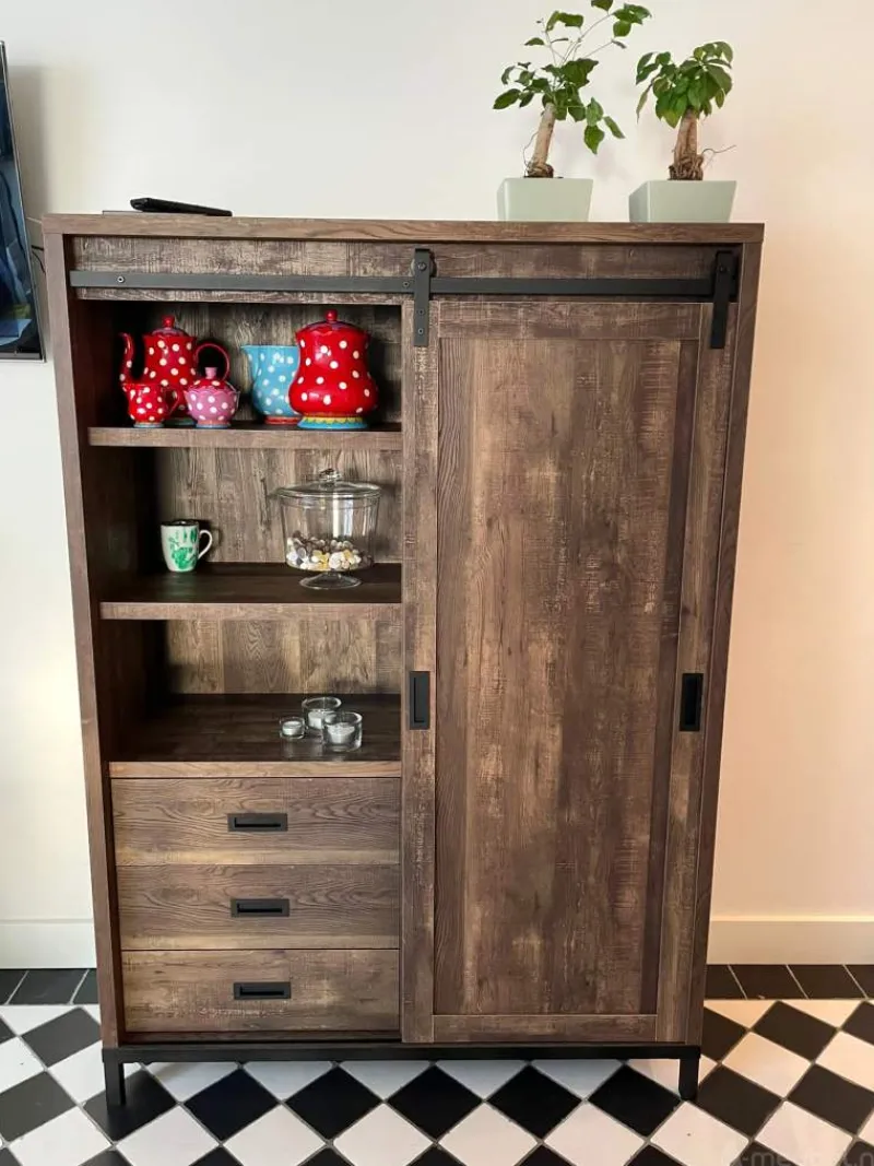 Voeg stijl en functionaliteit toe aan uw interieur met de Bergkast Staphorst. Met zijn espresso houtkleur en bijzonder design zal deze bergkast een opvallende aanvulling zijn in uw woonruimte. De Bergkast Staphorst combineert esthetiek met praktische opbergruimte. De deuren van de kast hangen aan robuuste rails, waardoor ze doen denken aan ouderwetse staldeuren en een uniek element aan de kast toevoegen. Met een hoogte van 170 cm biedt deze bergkast voldoende opbergruimte voor al uw persoonlijke bezittingen. Of het nu gaat om servies, boeken, of decoratieve items, deze kast voorziet in uw opbergbehoeften op een stijlvolle en georganiseerde manier. Upgrade uw interieur met de Bergkast Staphorst.