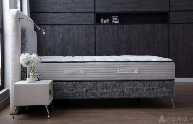 De boxspring staat op elegante, taps toelopende poten die een moderne flair geven aan het geheel. Optioneel verkrijgbaar is een bijpassend dat de chique uitstraling van het bed complementeert, met handige opbergruimte voor al uw essentiële spullen. Deze boxspring belichaamt een harmonieuze balans tussen design en comfort, en is een perfecte keuze voor wie een stijlvolle en herstellende slaapomgeving waardeert.
