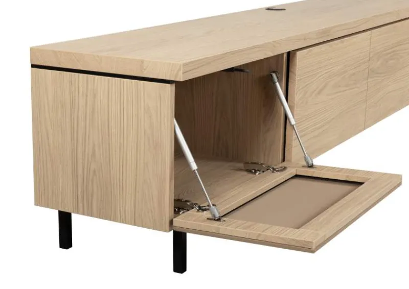 Dit strakke en moderne meubel biedt een minimalistisch design met praktische functies, ideaal voor een opgeruimde en stijlvolle woonkamer.