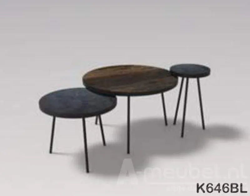 Deze salontafel set bestaat uit drie prachtige tafeltjes met een blad van donker scheepshout en een zwarte metalen frame. Door de verschillende hoogtes kunt u deze tafeltjes makkelijk onder elkaar schuiven. Zo kunt u wanneer nodig ruimte creëren of juist besparen. Vind u drie dezelfde tafels te saai? Dan kunt u de donker houten tafels mix & matchen met de grijze salontafels. U kunt kiezen voor één grijze salontafel in het midden of juist één tafel van donker hout in het midden. Kies de kleuren optie die u wilt in het dropdown menu.
