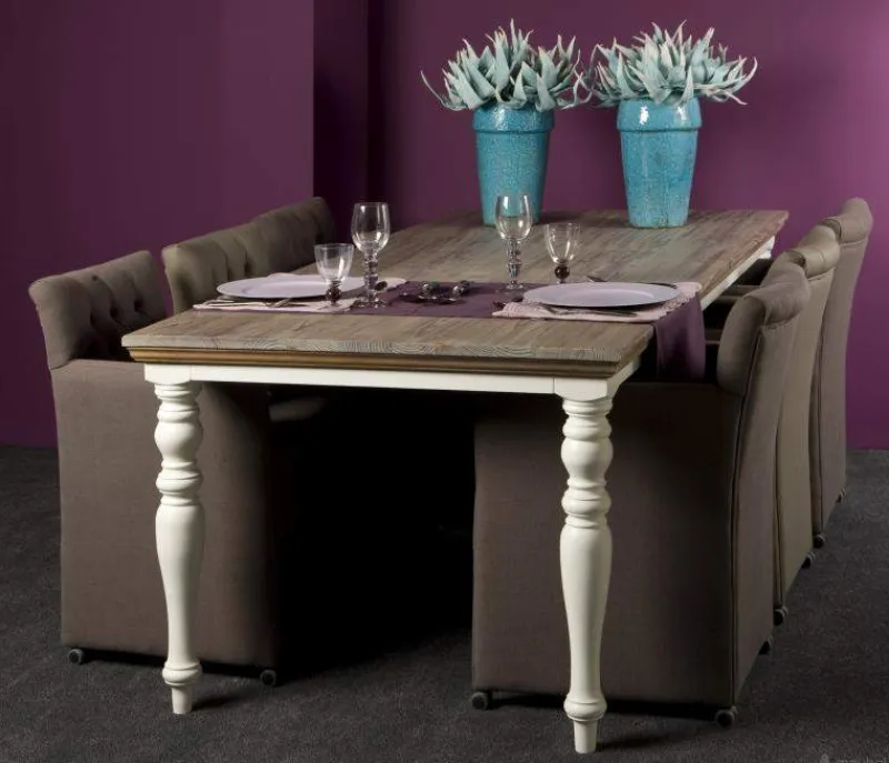 De romantische en landelijke woonkamerset fleur bestaat uit diverse trendy, witte meubelen met vergrijsde houten bladen. Met deze woonkamerset is uw interieur gelijk af. De woonkamerset fleur bestaat uit een dressoir, tv meubel, eettafel en salontafel.