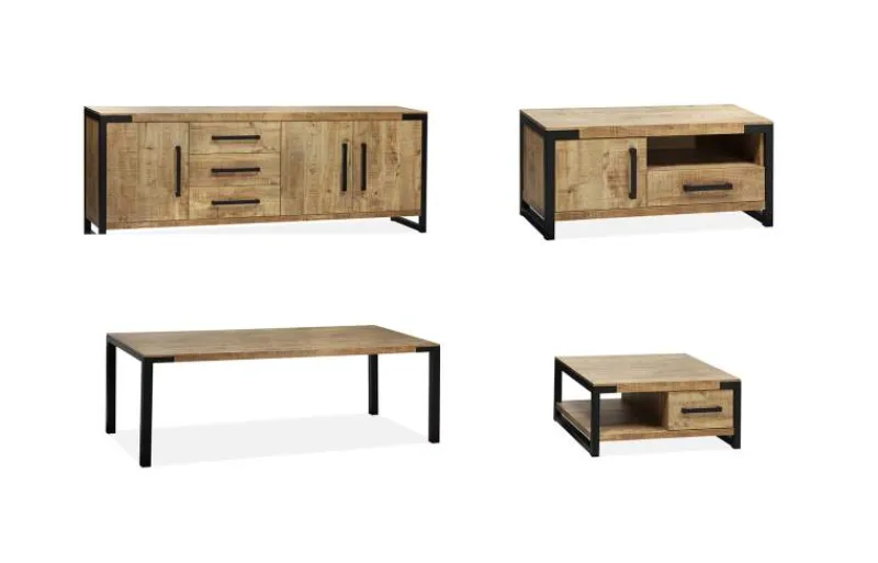 Deze set bestaat uit een dressoir voor al je opbergbehoeften, een eettafel om gezellig aan te eten, een salontafel die perfect past bij je zithoek, en een tv-meubel om je entertainmentruimte compleet te maken. Alle stukken hebben een mooie Mango houtlook met stoere zwarte poten die zorgen voor een strakke en samenhangende stijl in je interieur.