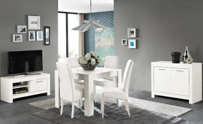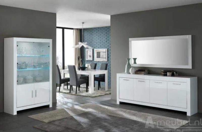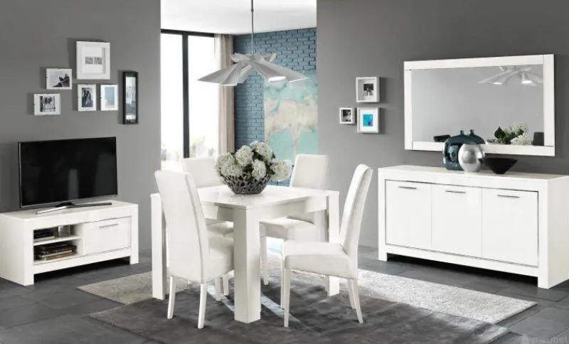 De woonkamerset Marknesse in wit is uitgevoerd in een strak design. Ideale meubels voor iedereen die van modern houdt. Wit is licht en creëert ruimte in je woonkamer. Ideaal te combineren met allerlei andere kleuren. De set bestaat uit een dressoir, een TV meubel, een salontafel en een royale eettafel. Je kunt de set aanvullen met een ruime kolommeubel of kiezen voor een groter dressoir of een ander model tv meubel. Met de fraaie spiegel maak je de inrichting van de woonkamer helemaal compleet.