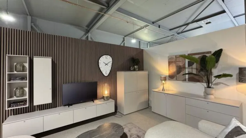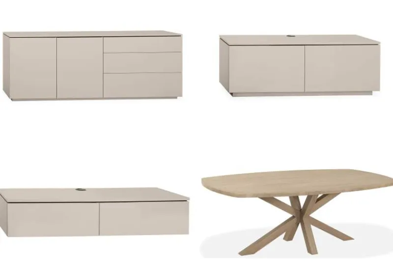 De Slagharen woonkamerset straalt een elegante balans uit tussen functionaliteit en design, en is hierdoor een stijlvolle aanvulling op elk interieur. Standaard zijn de kasten uitgevoerd als hangende variant, wat zorgt voor een ruimtelijk en elegant effect. Voor wie de voorkeur geeft aan een staande uitvoering, is dit tegen een meerprijs mogelijk. De set bestaat uit een dressoir, eettafel, salontafel en TV-meubel en is optioneel uit te breiden met een bergkast.