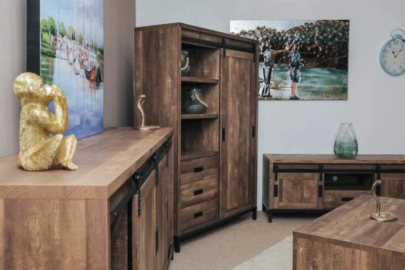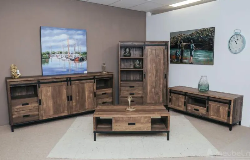 Ontdek de verfijnde esthetiek van de Woonkamerset Staphorst. Met zijn espresso houtkleur en opvallende design is deze set een blikvanger in elke woonruimte. De industriële afwerking voegt een stoere en eigentijdse uitstraling toe aan het geheel. Wat de Woonkamerset Staphorst echt bijzonder maakt, zijn de deurtjes die aan robuuste rails hangen. Dit geeft de meubels het karakter van ouderwetse staldeuren, wat een charmante en nostalgische touch toevoegt. Deze set is perfect voor zowel landelijke als industriële interieurs. De espresso houtkleur en de industriële afwerking sluiten naadloos aan bij deze stijlen.